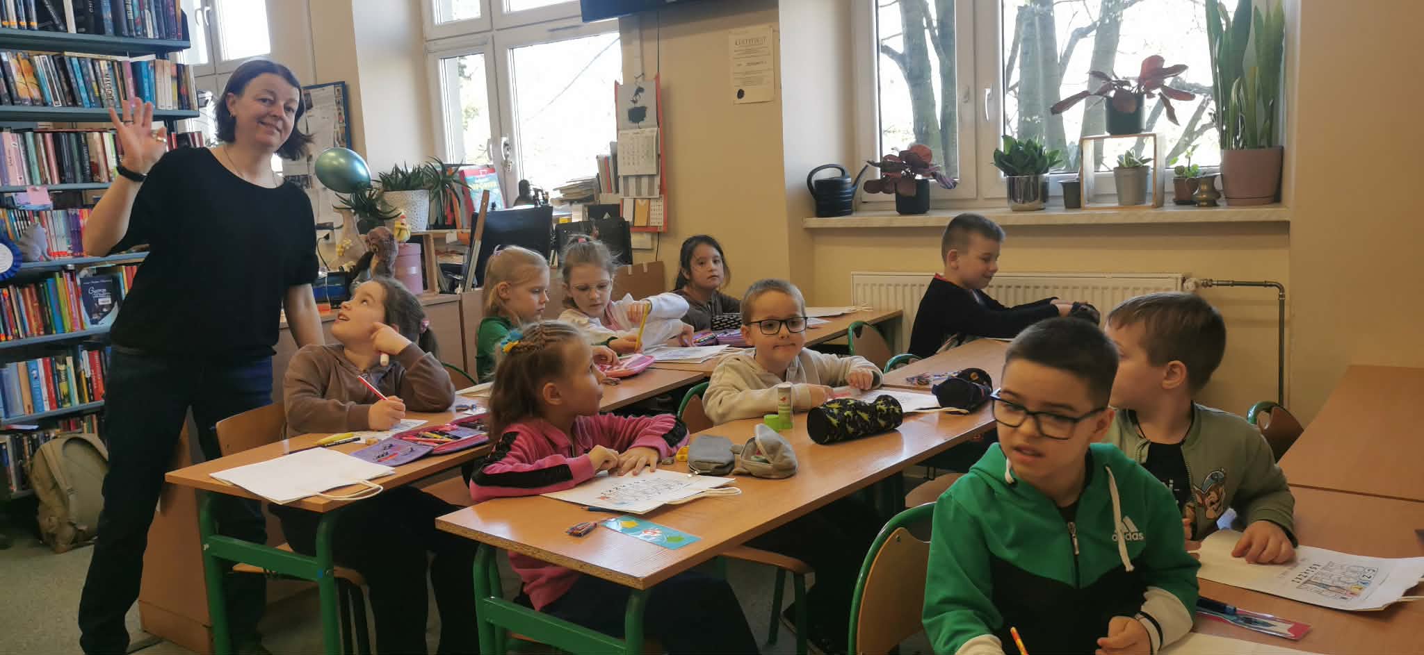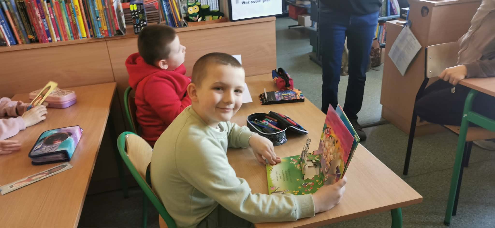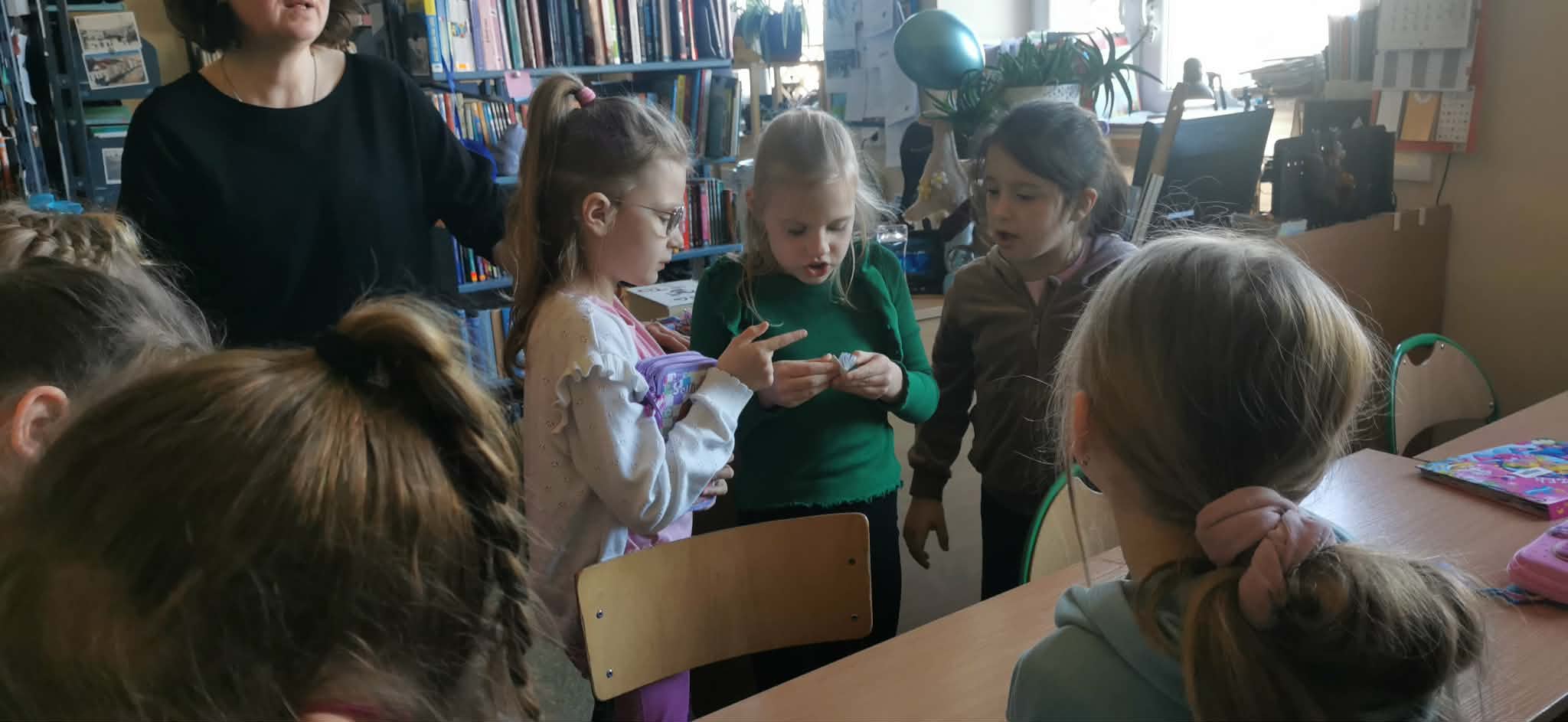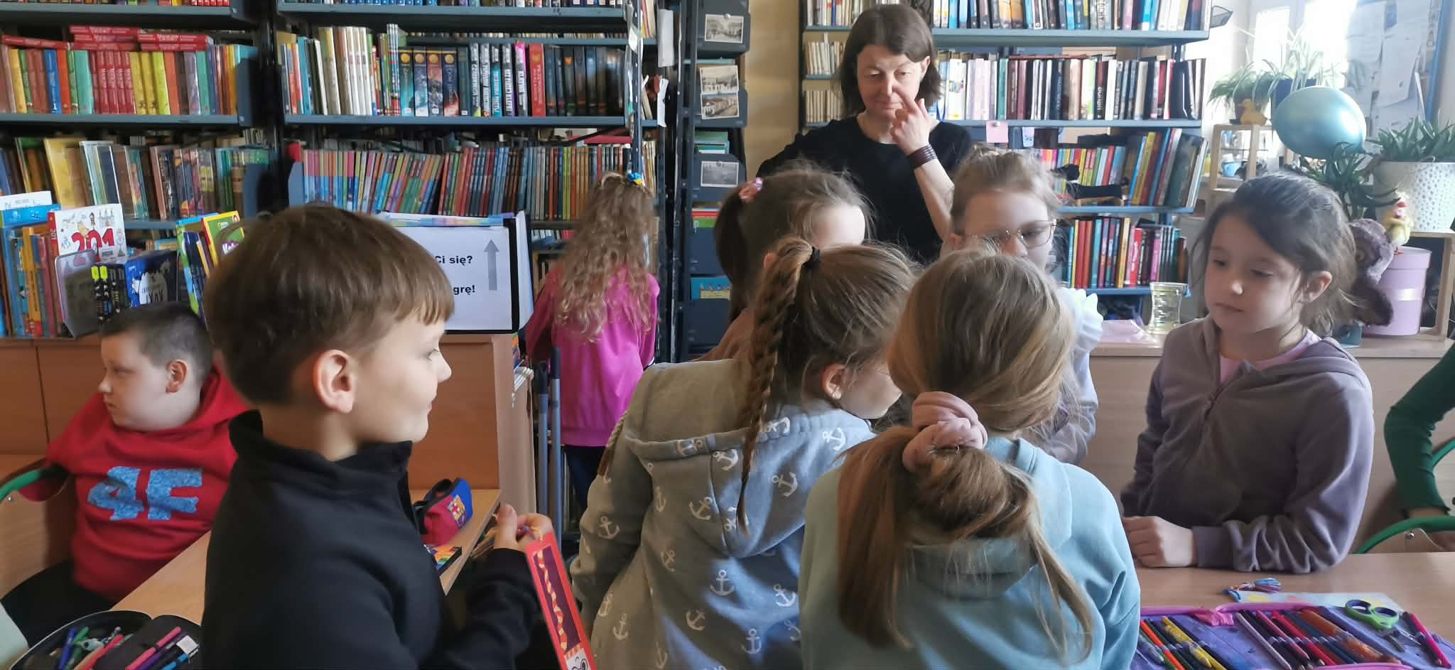 Niemniej atrakcji czekało na dzieciaki w naszej szkolnej bibliotece – były książkowe zgadywanki, kolorowanki i wierszyki oraz poznawanie bibliotecznych tajemnic. Pierwszaki poznały też naszego bibliotecznego rezydenta – sowę Ziutka.