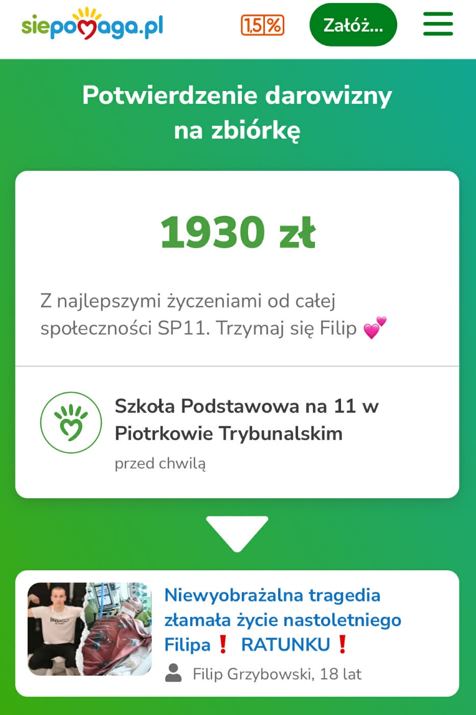 Przypominamy, że tegoroczny kiermasz świąteczny był wyjątkowy, ponieważ fundusze uzyskane ze sprzedaży ozdób przeznaczone zostały na rehabilitację i pomoc dla naszego absolwenta - Filipa Grzybowskiego. Z ogromną radością informujemy, że imponująca kwota 1930 zł (!!!) została już przekazana na konto wspierające Filipa w powrocie do zdrowia. Serdecznie dziękujemy całej społeczności szkolnej za wsparcie tak szczytnego celu.